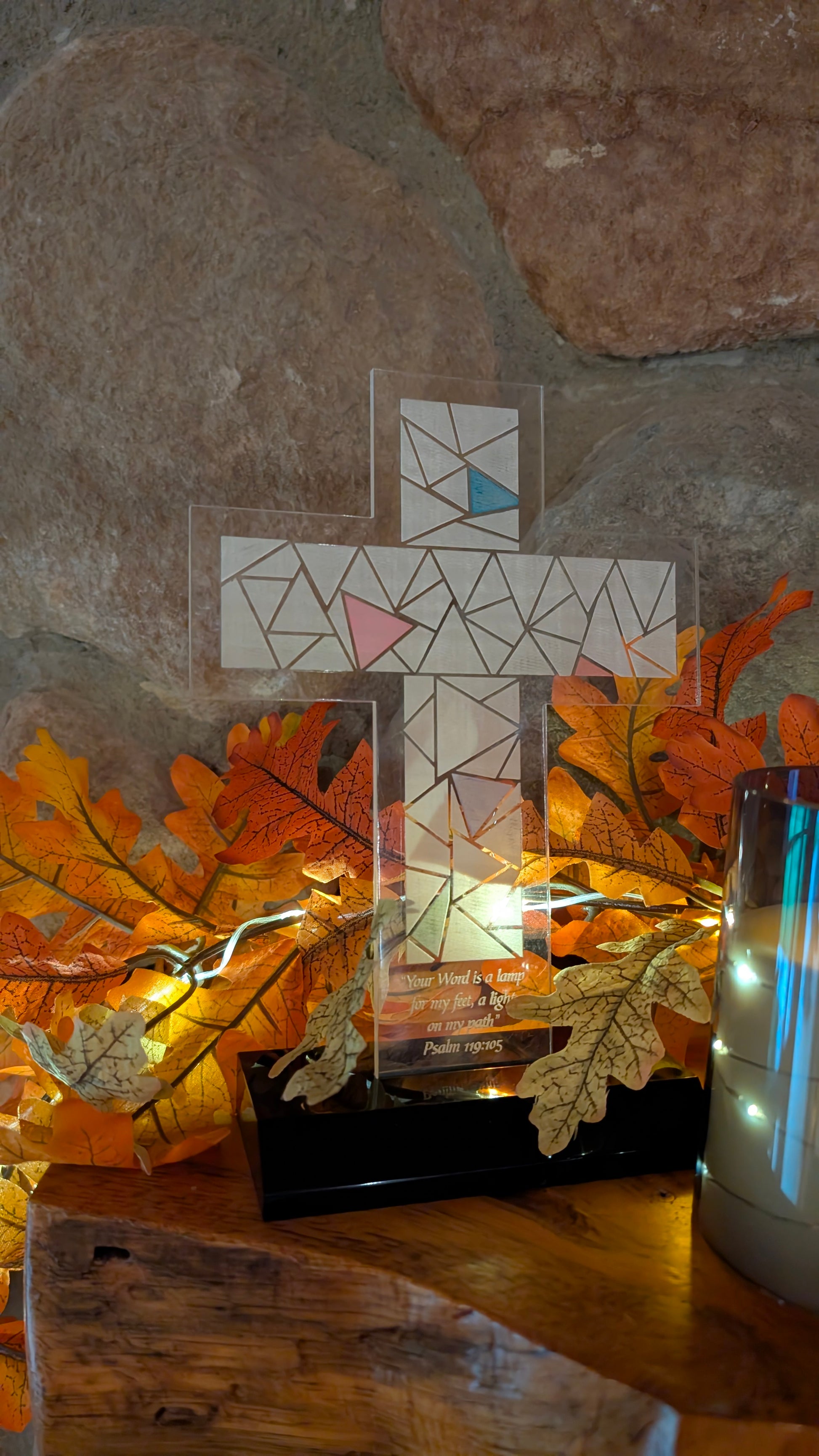 This unique piece features an elegant cross, precisely cut from clear 1/8" acrylic, set in an acrylic stand. What makes it truly special is the thoughtful detail within: the cross is meticulously divided into 66 distinct sections, each one representing a book of the Bible.